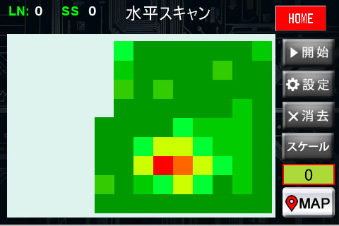 水平スキャンモードでは、探査範囲をグリッドパターンで可視化し、各セルの信号強度に応じて色分け表示を行います。最も強い反応は赤色で示されるため、ターゲットの位置を即座に把握できます。